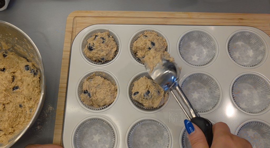 Divide the batter evenly into muffin cups and top with the extra blueberries.